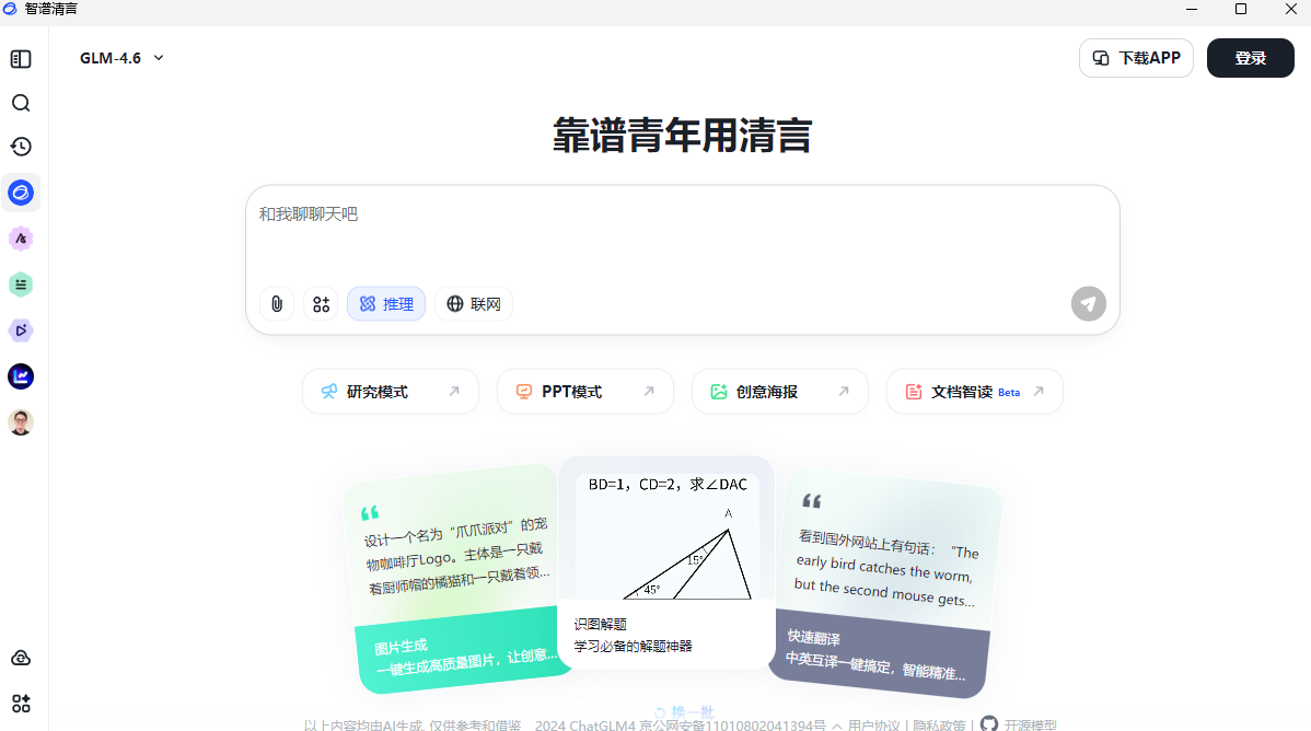 智谱清言,拥有千亿参数对话模型,支持多轮对话,具备内容创作、信息归纳总结等能力。基于ChatGLM中英双语大模型开发,通过万亿字符的文本与代码预训练,结合有监督微调技术,具备通用问答、多轮对话、创意写作、代码生成、虚拟对话、AI画图、文档和图片解读等能力。期待成为你的得力助手,无论在工作、学习,还是日常生活中我们都一直陪伴你。