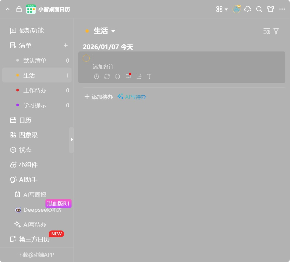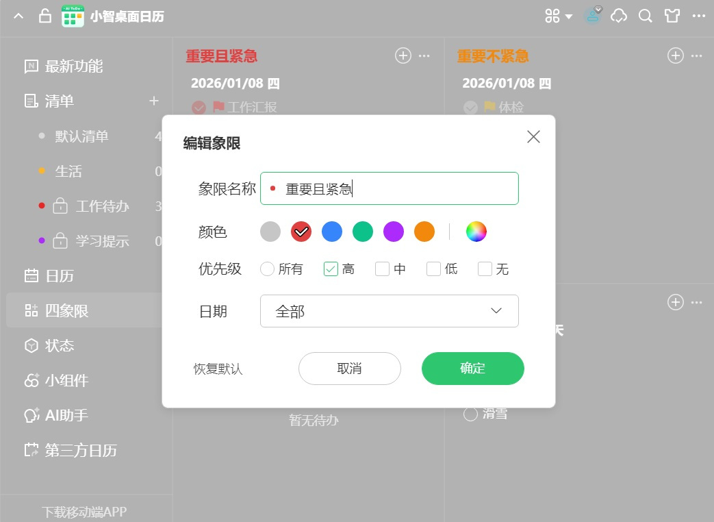 小智桌面日历(原小智ToDo),致力于给用户提供记录待办,管理日程等所需功能和内容服务,还可以多终端数据同步,以及未来拓展的番茄钟、小习惯打卡等,让用户可以更高效管理自己的时间任务,快乐生活,畅快工作。