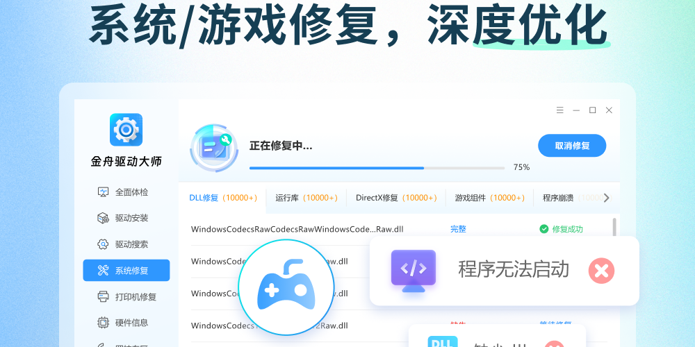 4.DLL修复/DirectX修复:集成了DirectX修复和DLL文件修复服务,快速解决因DirectX错误导致的游戏启动报错、崩溃等问题使用金舟驱动大师。