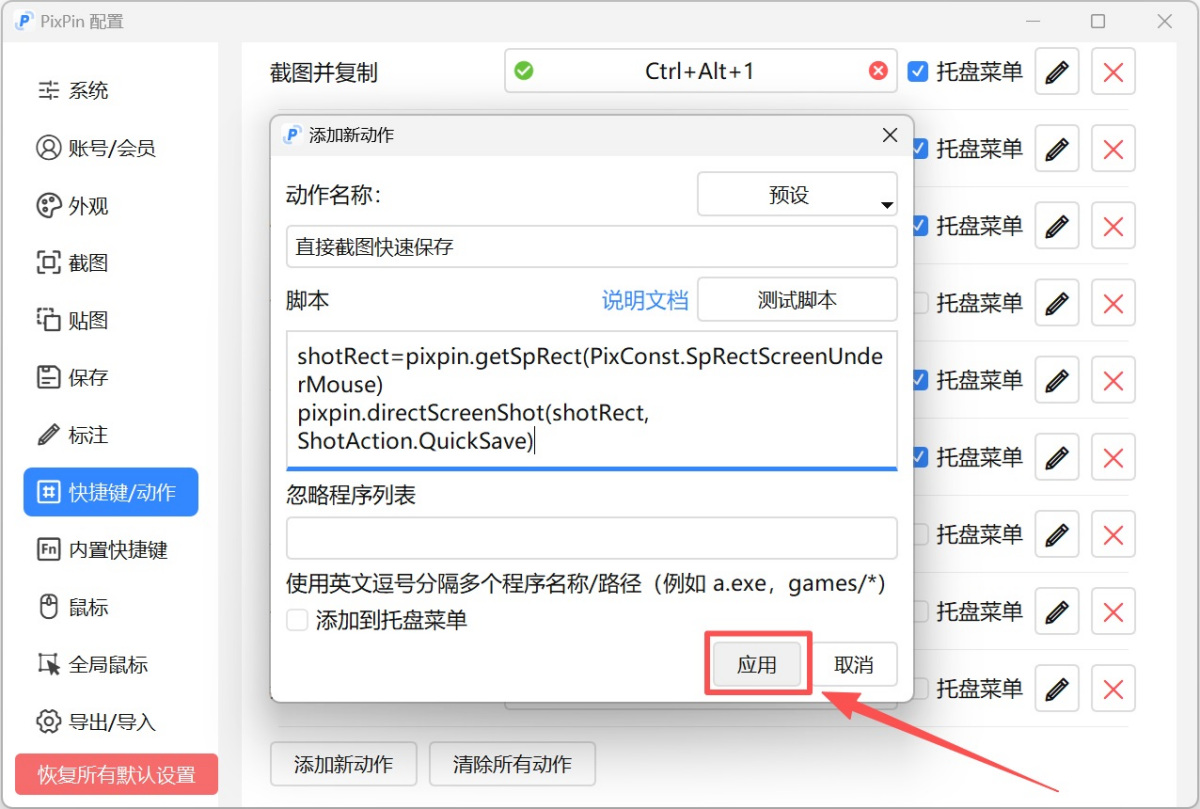 3、动作名设置为【直接截图快速保存】,脚本设置为下面的脚本,点击【应用】。