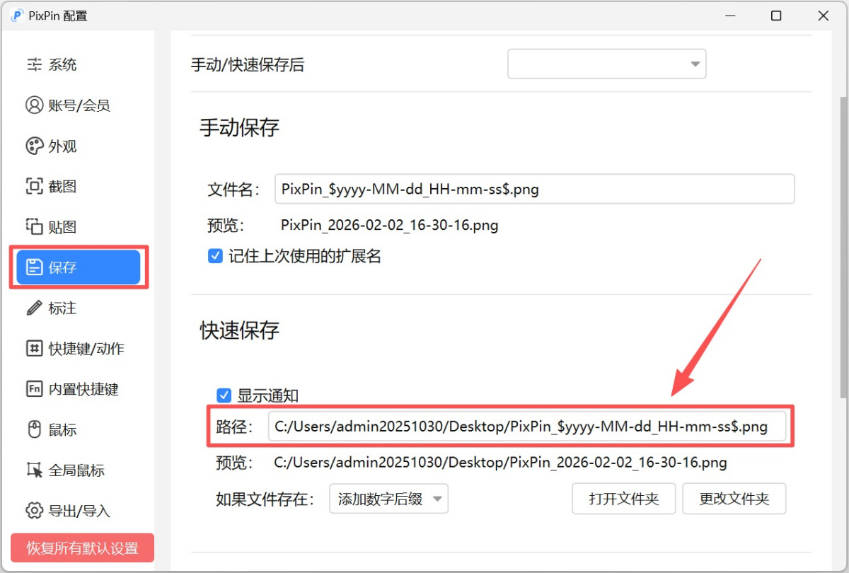 1、进入PixPin【配置】,选择左侧栏的【保存】,在快速保存页面中设置【路径】。