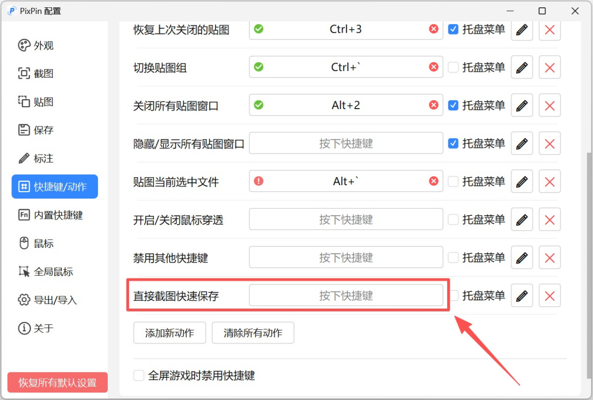 通过快速保存和自定义动作,可以实现按下快捷键后直接截图并保存指定文件夹。