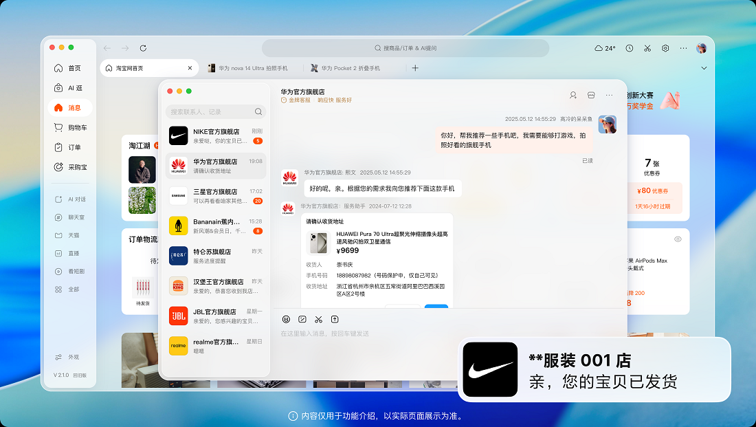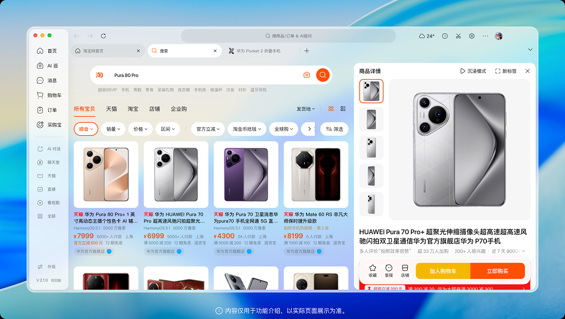 1.新增超级地址栏 ,同一个输入框支持商品和店铺搜索、已买到宝贝搜索、购物车搜索、AI对话、企业采购需求输入和网址输入;