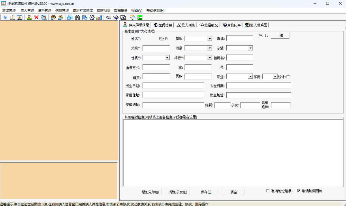该软件是目前市场上唯一直接对树操作的族谱管理软件,可以在树世系图上任意增加族人,选择某一族人后可以增加兄弟或子女。增加族人人数无限制。使用鼠标右键操作,符合大家的操作习惯。可以任意修改族人在树上的位置,方便在填错父亲的情况下将其修改回原来在树上的位置。在树上的位置可以整个分支改挂到另外一个分支,调整族人分支很方便。适合先建族人后修改父亲等需求。