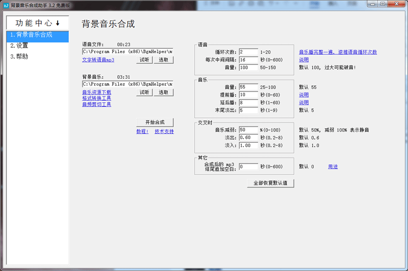 背景音乐合成助手官方版是一款强劲实用、适用范围广泛的音乐制作工具,背景音乐合成助手官方版能够给录音/语音/音频添加背景音乐,也可以对已经录好的语音文件和音乐文件混合穿插制作成广告。背景音乐合成软件中包括语音、音乐文件,音量,循环次数,循环间隔,音乐提前、延后,播放时音乐音量降低以及音乐淡入淡出功能。