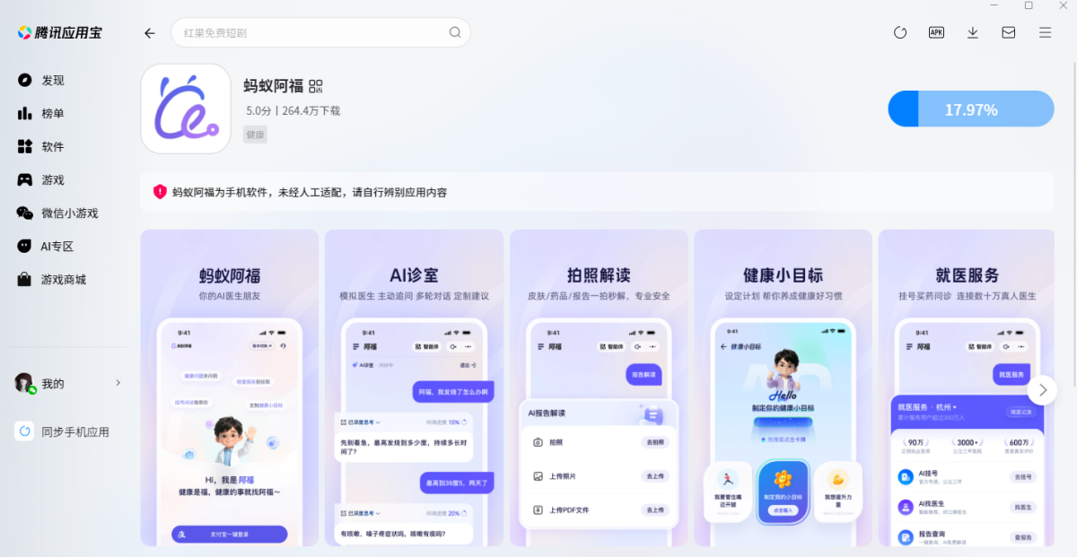 蚂蚁阿福是一款蚂蚁集团开发和运营的医疗健康AI应用,为用户提供各类健康咨询、图片解读(报告、病例、处方、药盒均支持)、个人和家庭健康档案管理及各类医疗健康服务,如预约挂号、云陪诊等。