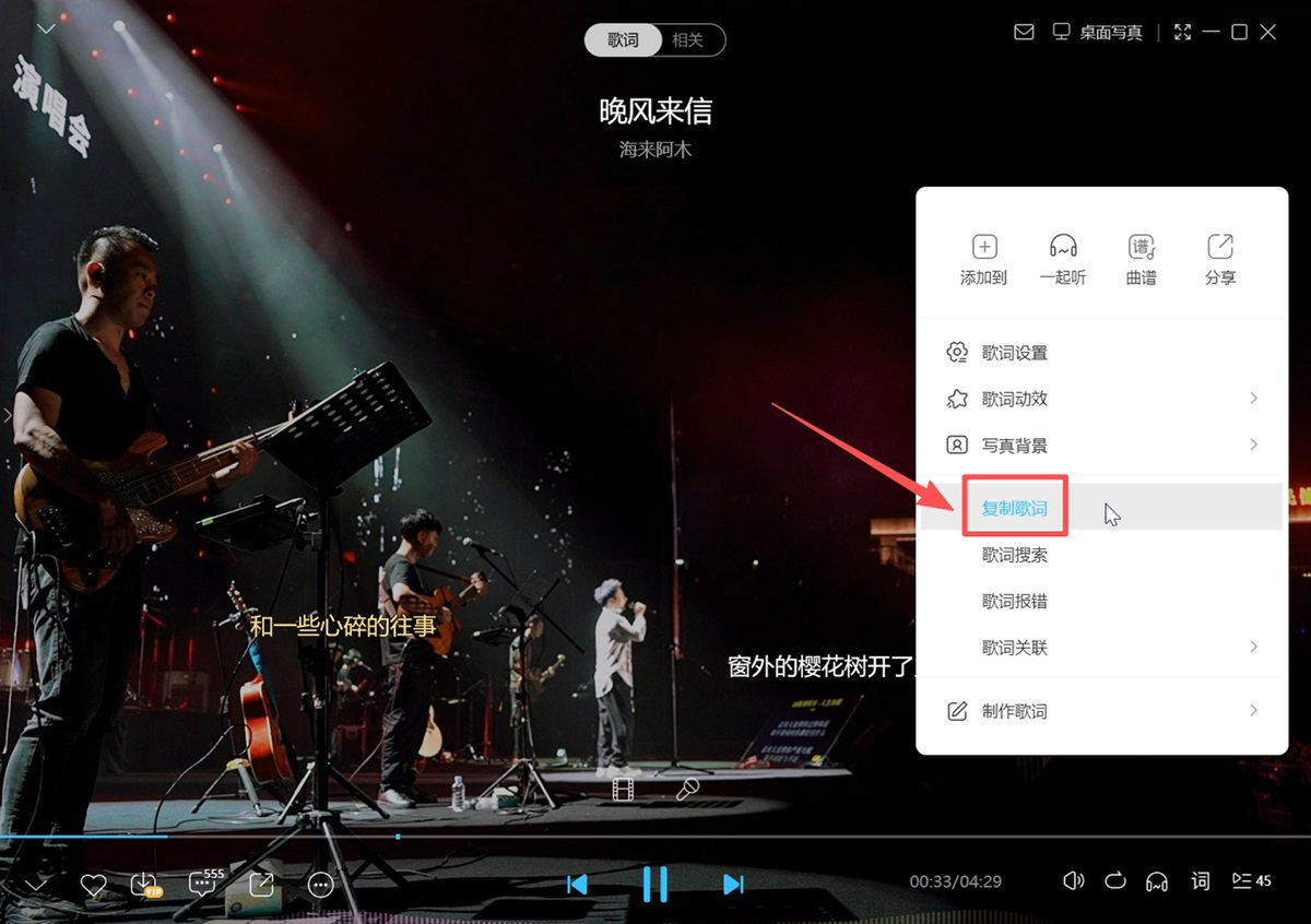 步骤2、在歌词界面,点击歌词下方的【麦克风】图标