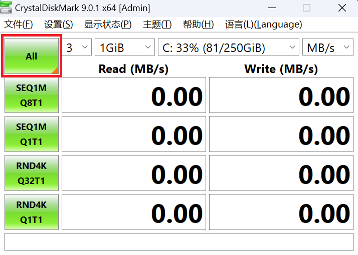 谈到测试,Crystal DiskMark只需要几分钟就可以执行所有的基准测试。为了获得最准确的结果,建议在按“开始”按钮之前关闭所有其他应用程序。
