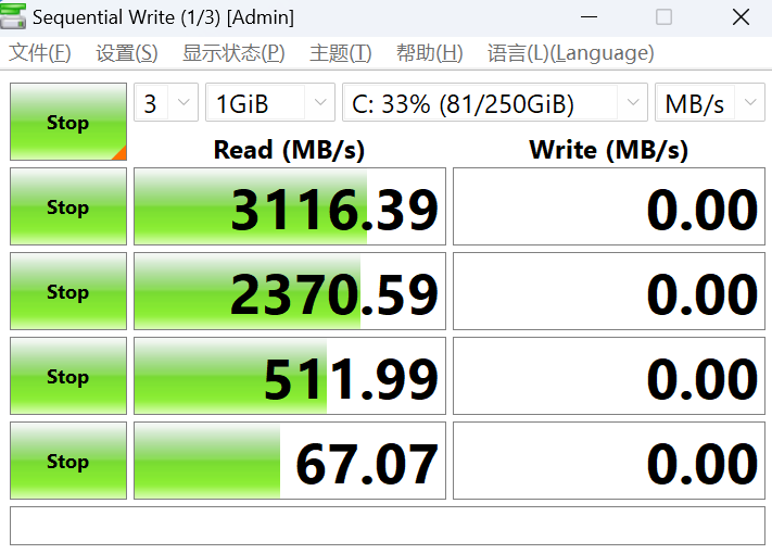 这个工具不会给您的处理器和RAM带来很大的压力,但是最好在Crystal DiskMark执行测试时不要打开文档,无论是顺序读或写,还是随机读取或写4KB/512 KB。
