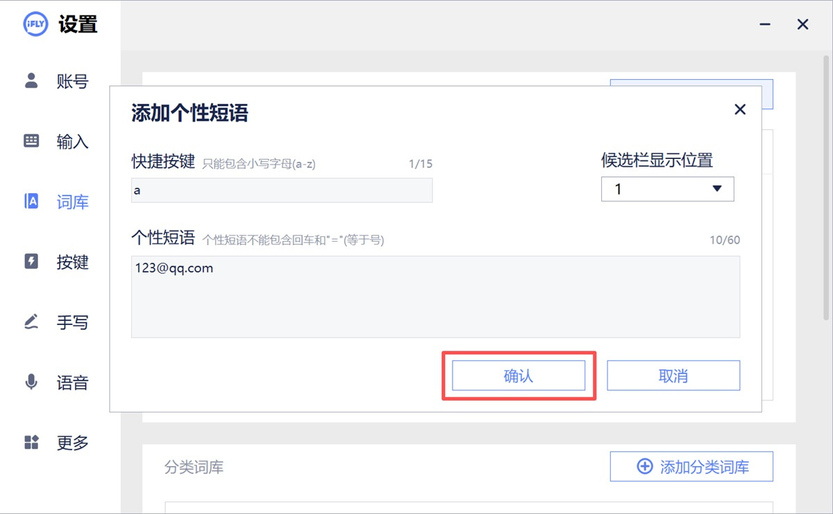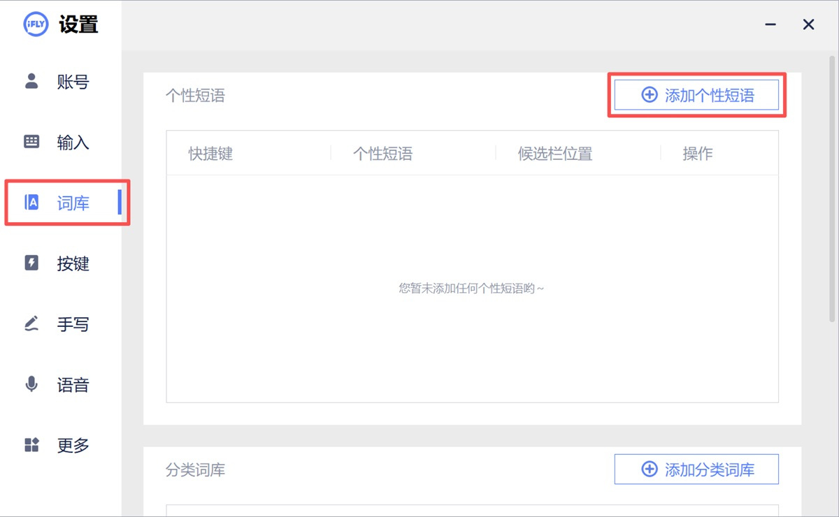 步骤2、选择左侧【词库】,点击【添加个性短语】