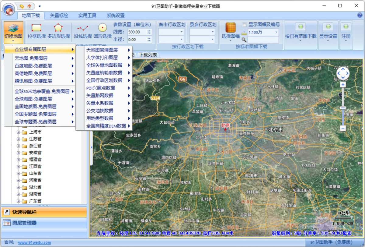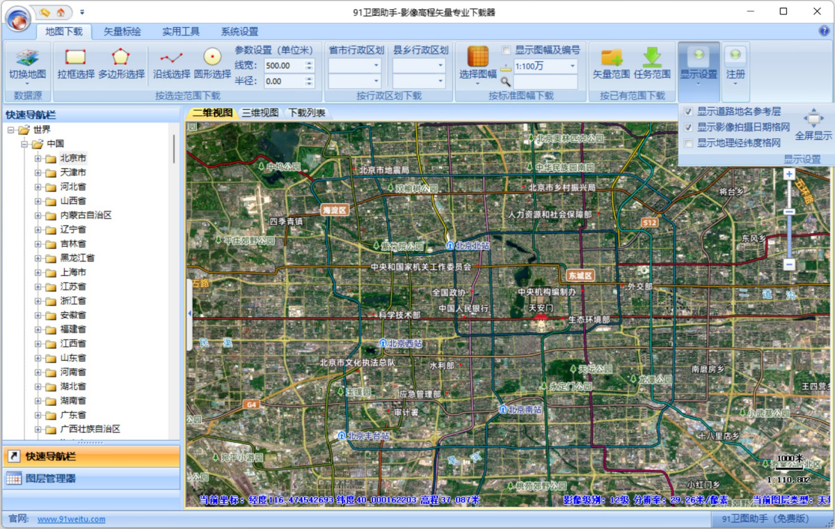 91卫图助手是一款地理信息系统软件,是全球首款真正的Google Earth影像、历史影像、高程专业下载器,软件本身的功能极为强大,观看操作的界面也是简单明了。91卫图助手通过对Google Earth数据传输协议的完全解译,支持全球高精度高程数据下载,且直接从服务端下载整块高程数据,区别于其他软件基于google Earth的逐点采样方式,下载效率高,数据精度高。
