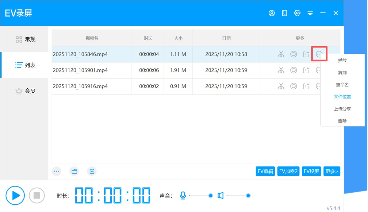 点击【列表】打开视频列表,双击视频文件即可播放视频;点击如图所示按钮还可选择复制、重命名、文件位置、上传分享和删除。点“文件位置”可快速定位到文件在电脑的哪个位置。