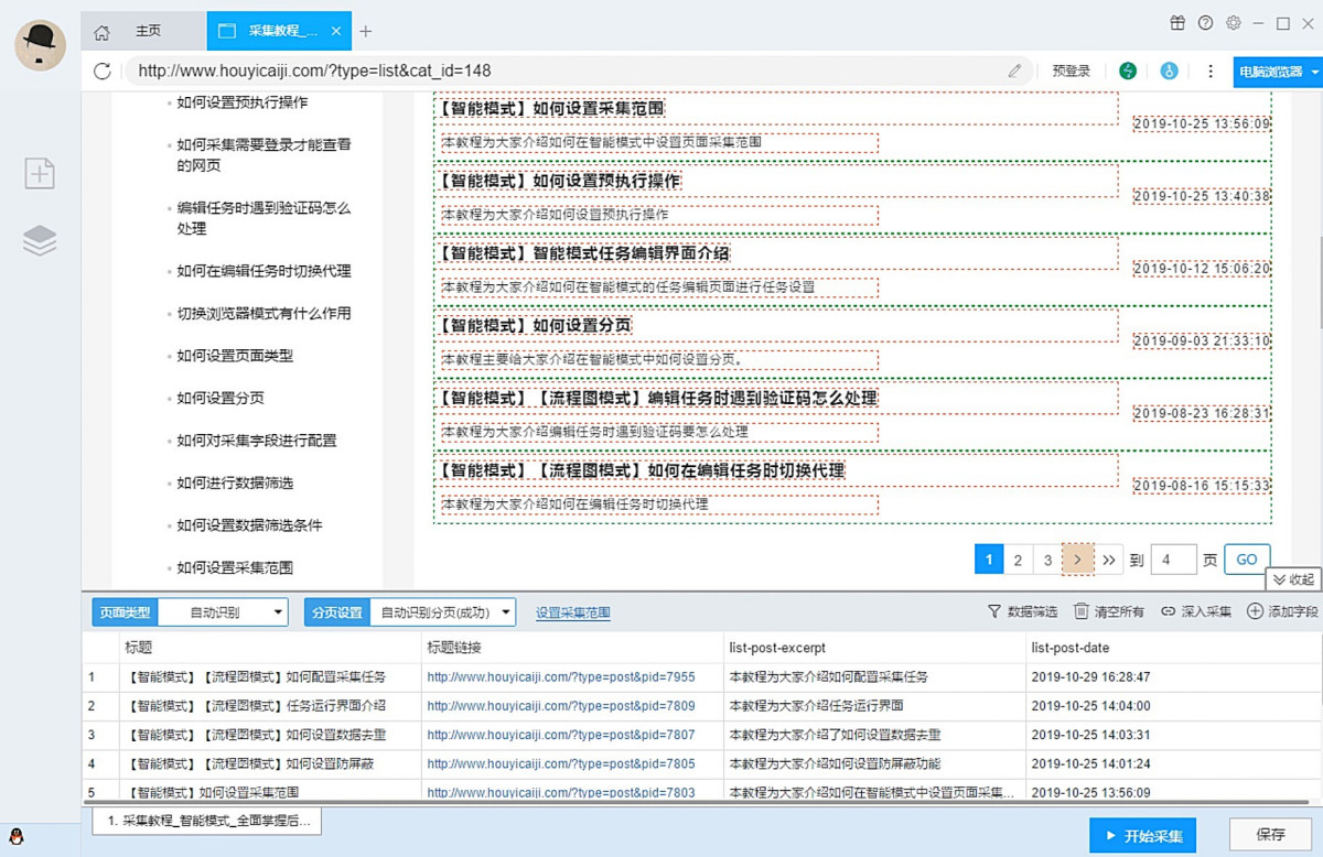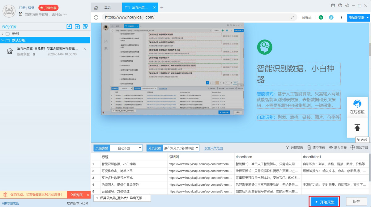 ●智能模式:基于人工智能算法,只需输入网址就能智能识别列表数据、表格数据和分页按钮,不需要配置任何采集规则,一键采集。