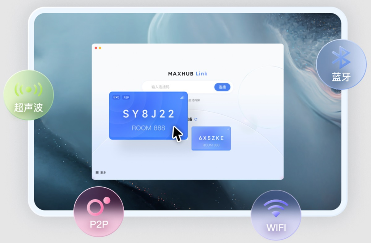 Wi-Fi/蓝牙/超声波融合发现技术,精准识别设备,高效入会投屏,同一会议室内,连接准确无误。