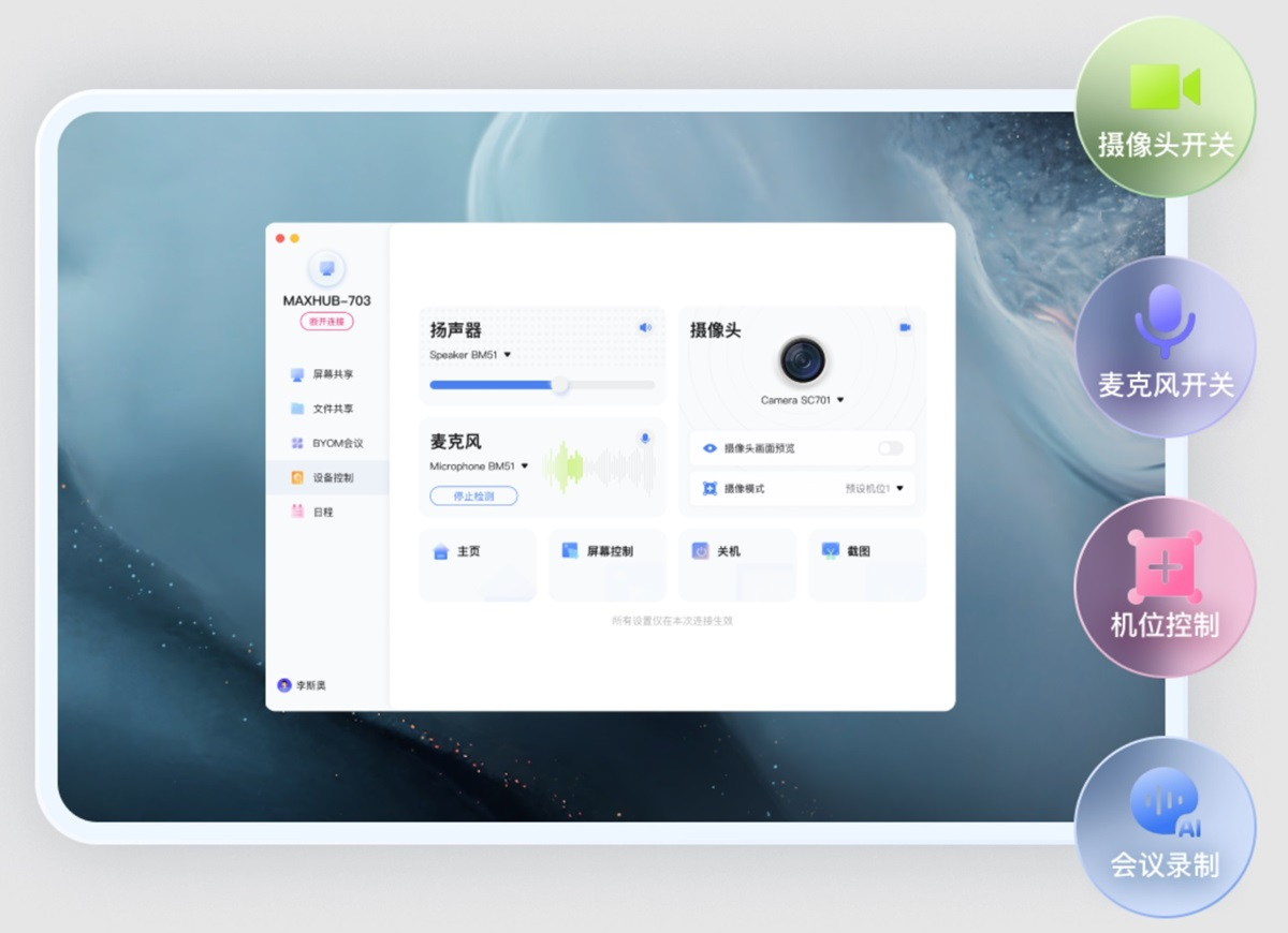 文件传输、设备控制一应俱全;BYOM设备调用,会议更智能;坐不离席,轻松管理全局。