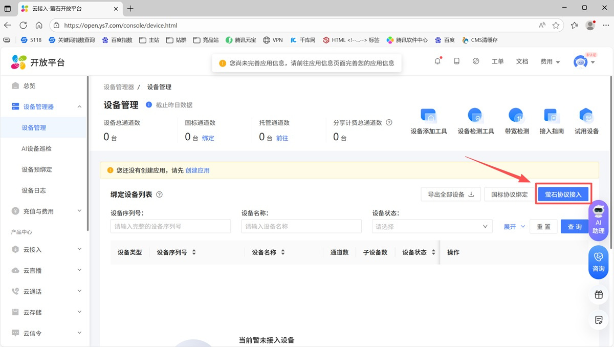 步骤3、点击【萤石协议接入】入口,在弹窗内输入设备序列号和设备验证码