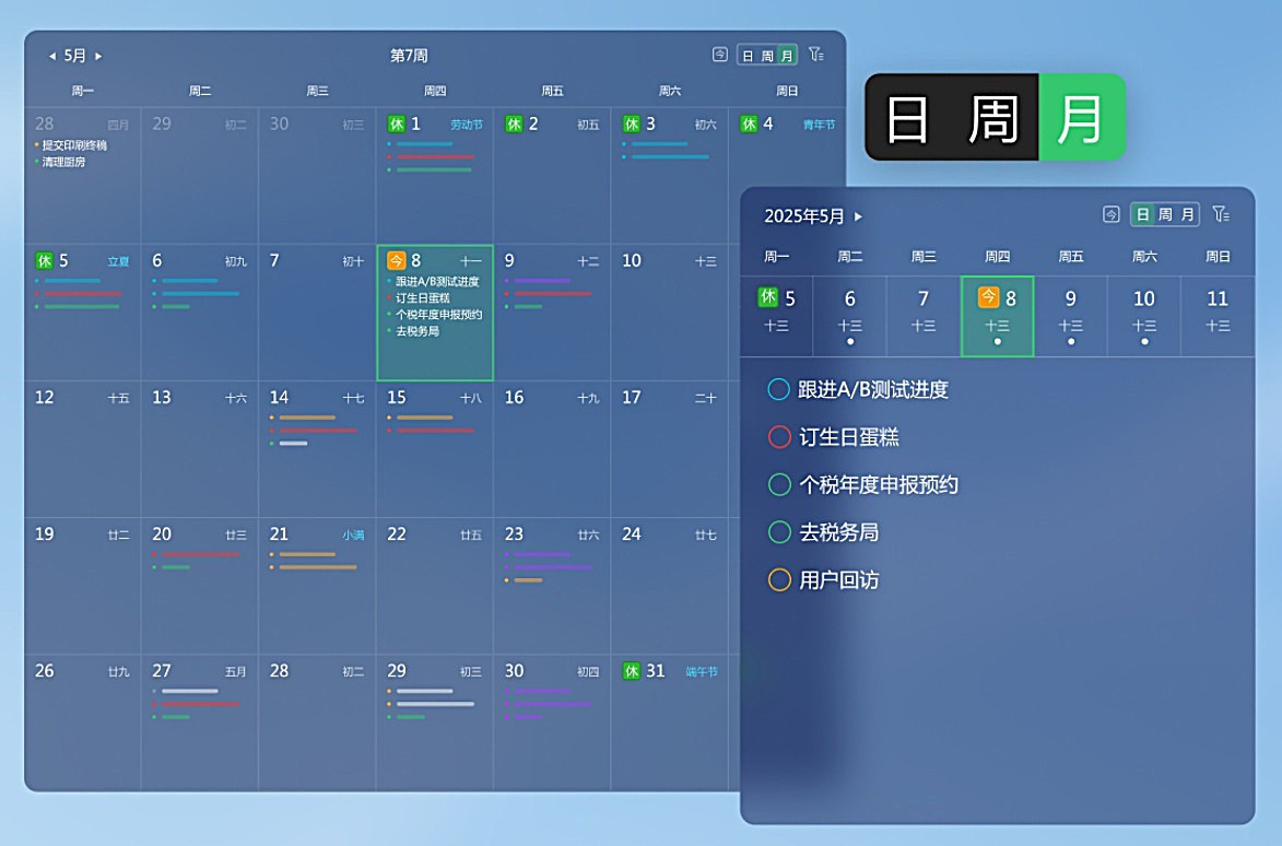 3、贴心任务时间管理:待办多样清单与日历视图、重复提醒、自定义筛选与导出,桌面日历便签及天气预报;