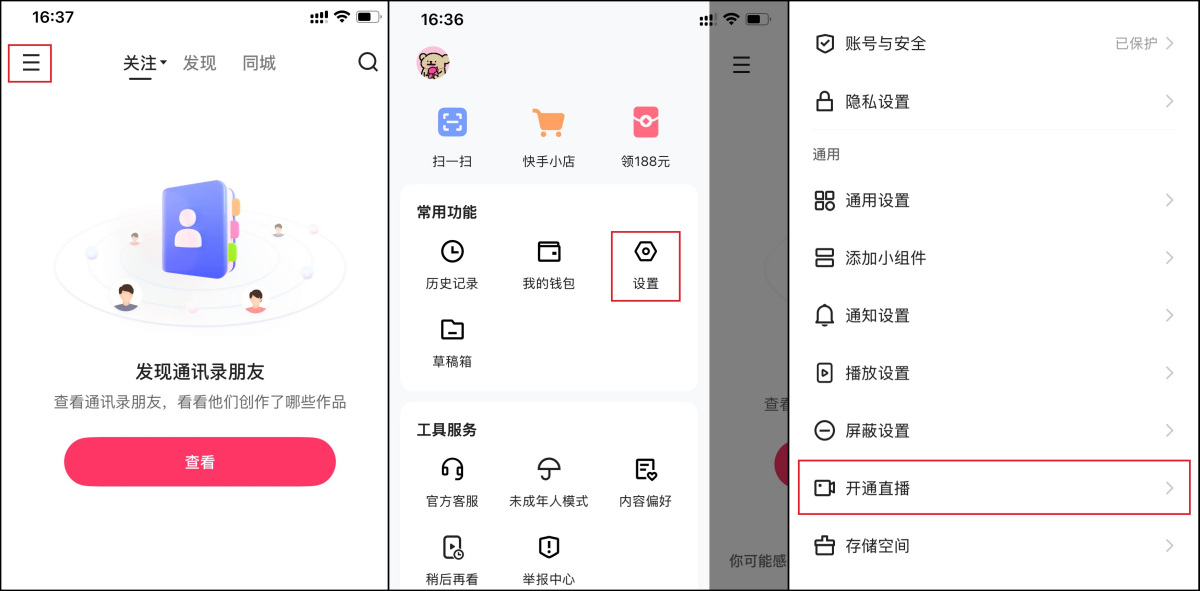 1、打开快手APP,点击首页左上角【≡】,在侧边栏找到【设置】→【开通直播】,请按照提示进行实名认证。
