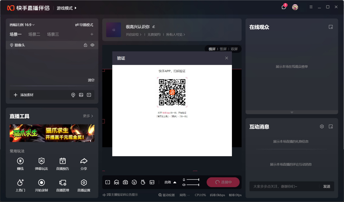 2、认证成功后打开快手直播伴侣客户端,选择您的直播模式。