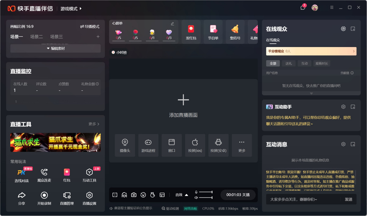【一键开播】只要在快手平台有直播权限的用户都可以使用伴侣进行直播。支持超清游戏画面、自定义直播封面,一键开启游戏直播之旅!