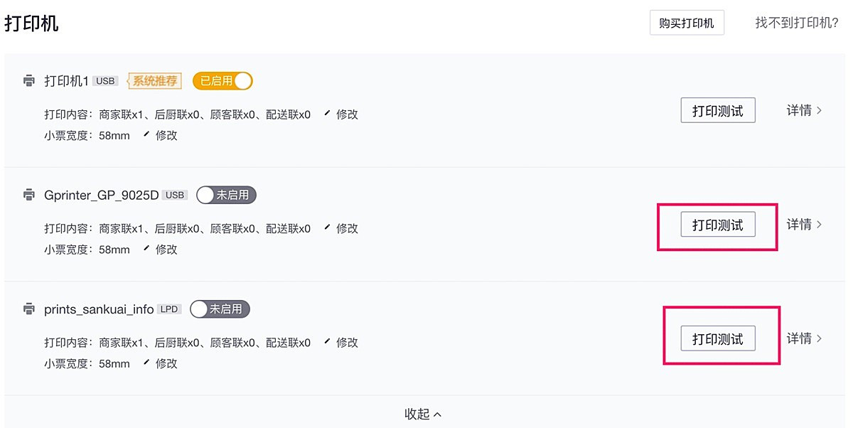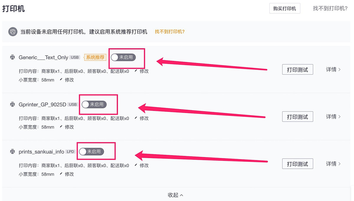 步骤5、确保能打印出测试小票的打印机处于“已启用”状态、不能打印的打印机处于“未启用”状态(通常情况下,如果您只有一台打印机,请确保只有一台打印机处于“已启用”状态)
