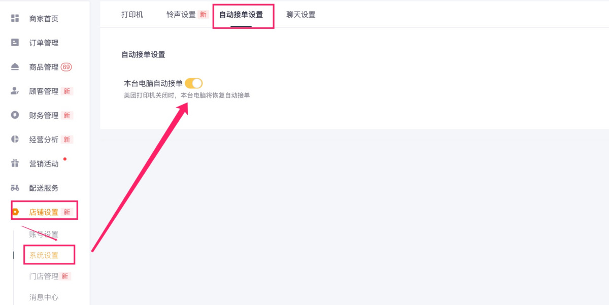 在左侧菜单点击【店铺设置】,选择【系统设置】→【自动接单设置】,开启本台电脑自动接单(仅需一次开启即可安心使用)