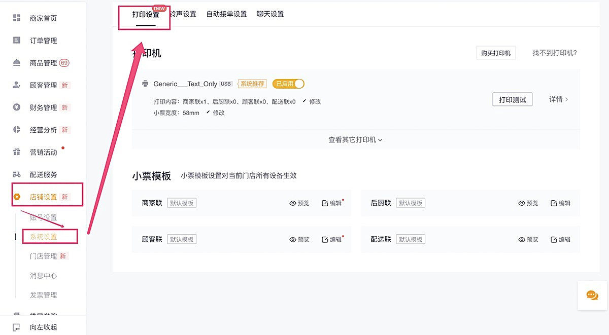 步骤1、在左侧菜单【店铺设置】→【系统设置】→【打印设置】中找到打印机