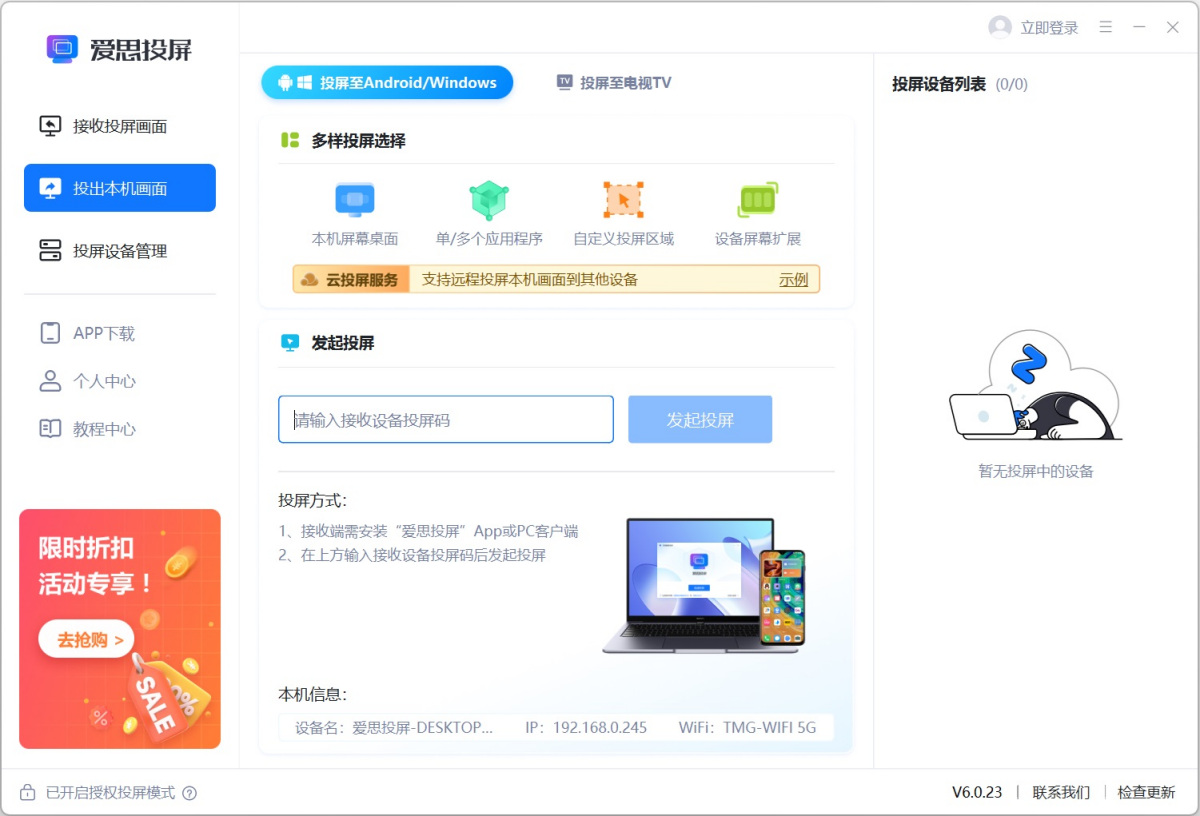 爱思投屏是一款能够同时兼容i0S和安卓手机的投屏软件,无论您是办公投屏还是直播投屏,都可以超清画质投大屏观看,支持多种方式投屏。爱思投屏支持多个直播间,多种渠道同时推流,投屏录制同步进行。多端互投、直播投屏、影音娱乐、工作会议,一屏畅享多场景!