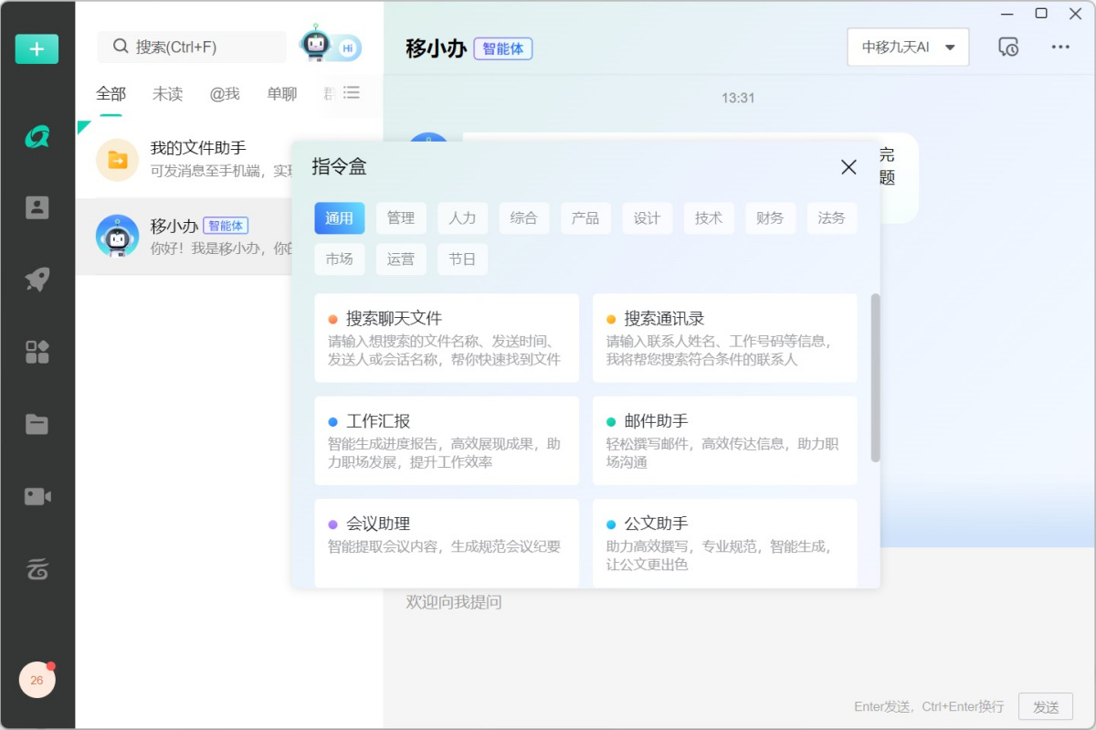 可以与智能体聊天对话,也可以通过[指令盒]选择指令(如周报助手、工作汇报等),输入关键内容后发送指令,智能体将根据指令进行相应回复,协助你解决工作中的各项问题。