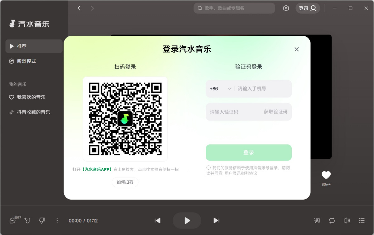步骤1、打开汽水音乐电脑版,使用手机版App扫描二维码【登录账号】