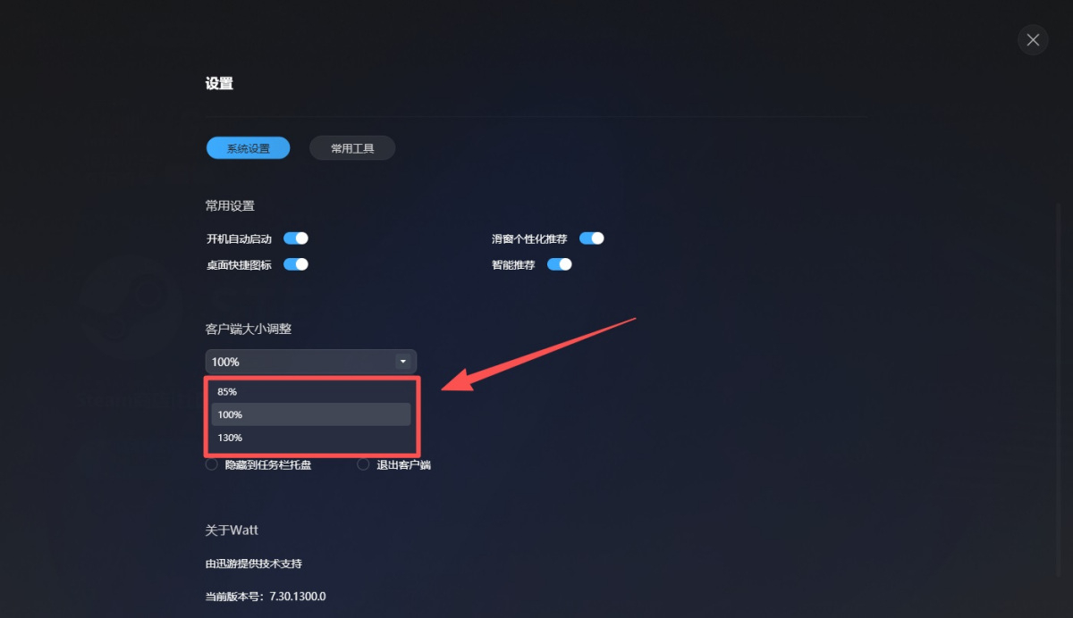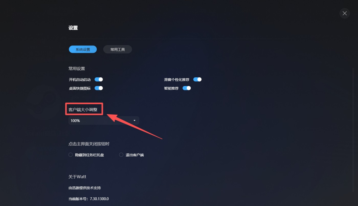 步骤2、进入设置后,找到【客户端大小调整】选项,点击其右侧的【▼】下拉按钮。