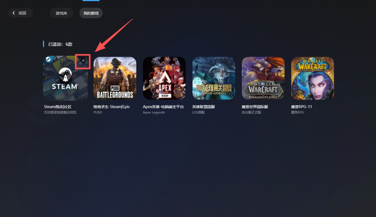 2、将鼠标光标放在想要删除的游戏上,出现【×】点击删除即可