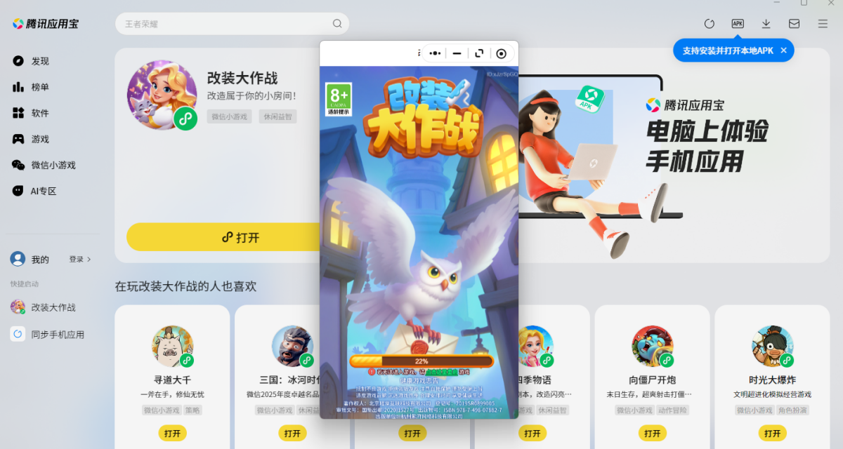 第二步:应用宝电脑版打开后会直接调起游戏,选择微信扫码或其他方式登录账号