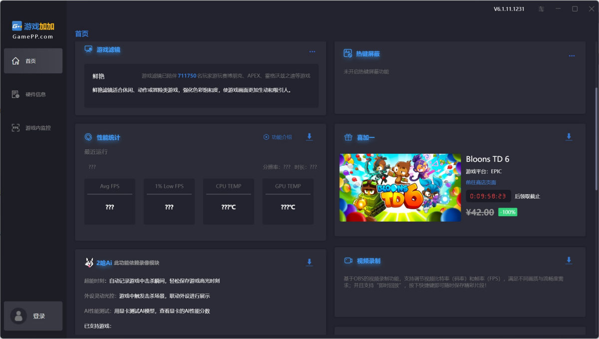 1.游戏加加轻量版首页支持功能模块化下载,首批支持功能:硬件信息、游戏内监控、游戏滤镜、性能统计;
