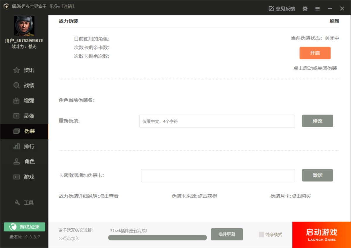 战力伪装可以通过偶游坦克世界盒子PC版界面修改自定义战斗力,并且在游戏中显示(并不会修改真实战斗力)。伪装功能实现需要有伪装卡支持,伪装卡的获得可以查看右边链接。查看完整伪装说明