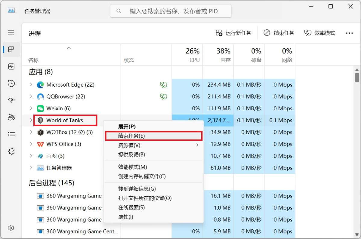 1.Ctrl+Alt+Esc按键呼出系统任务管理器,找到坦克世界游戏右键鼠标点击【结束任务】。(如果没有可跳过第一步看第二步)