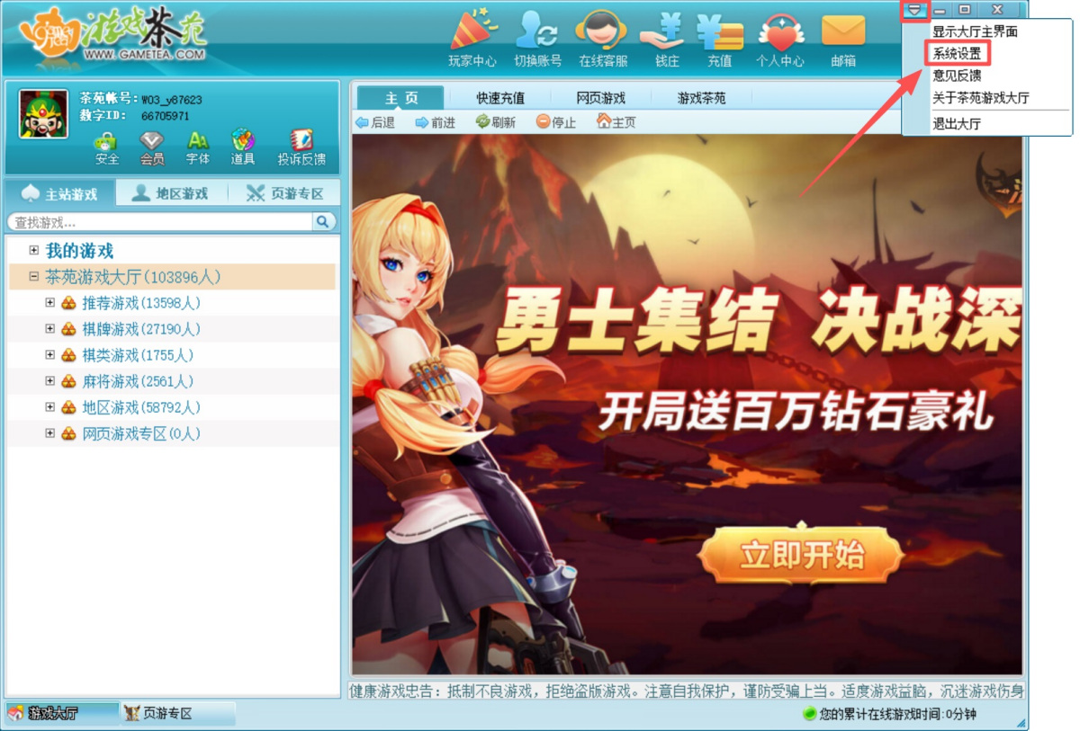 1、打开游戏茶苑,点击右上角的更多按钮,选择【系统设置】。