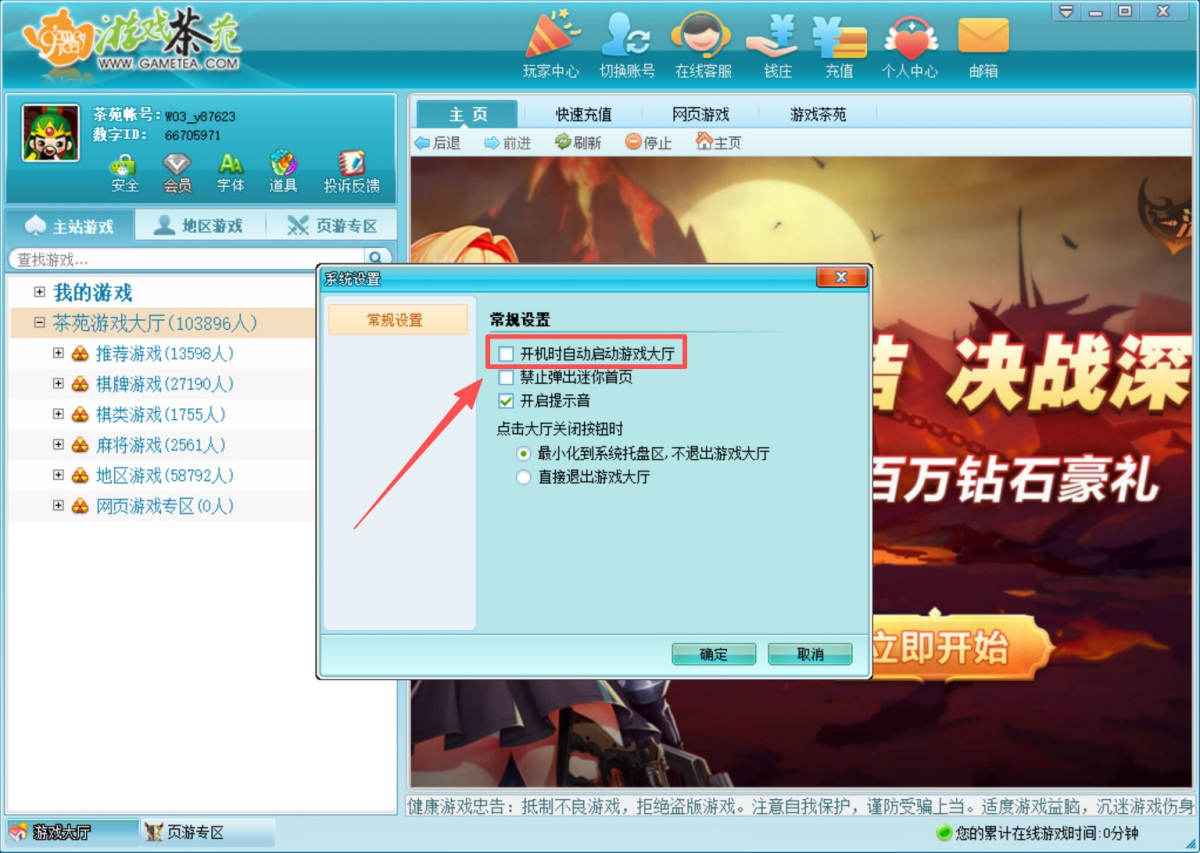 2、取消勾选【开机时自动启动游戏大厅】即可。