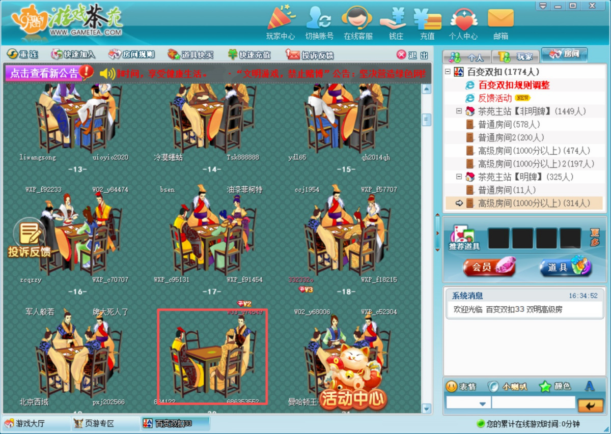 2、进入游戏房间后,会显示当前房间的玩家及桌子,您可以选择一个还未开始游戏的桌子加入游戏。