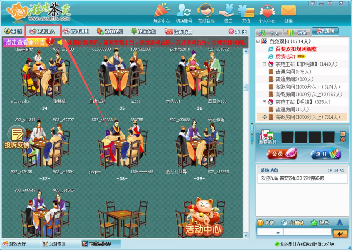 3、如果希望快速选择座位坐下,可以直接点击房间上方的“快速加入”按钮,系统会自动给您寻找空余的游戏座位,帮您加入游戏。