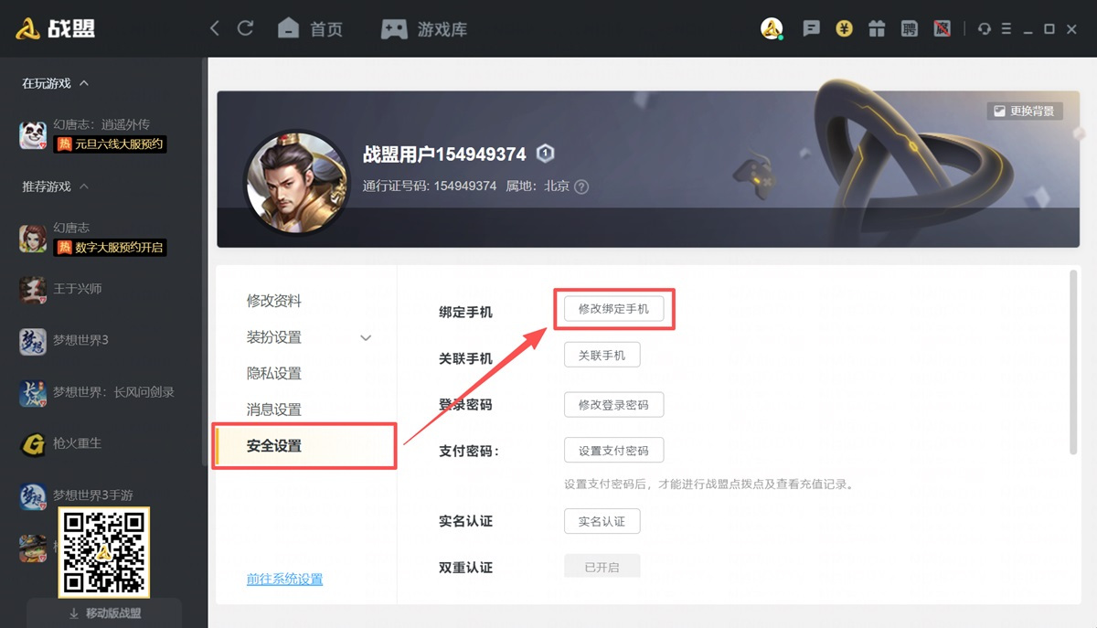 步骤2、在左侧栏选择【安全设置】,点击【修改绑定手机】