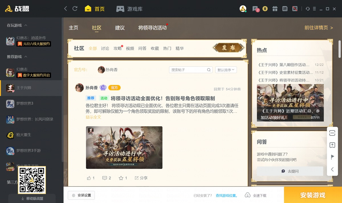 战盟(原多益战盟)是多益网络推出的游戏平台,可一站式畅玩多益精品游戏,还有专属游戏礼包,最新游戏资讯,精品游戏攻略。战盟打通游戏内外,让你随时联系游戏好友与帮派等圈子,还可语音畅聊,组队开黑更方便。小号管理、游戏修复等多种便捷工具让你尽享游戏乐趣。用战盟,做一辈子的“战友”!