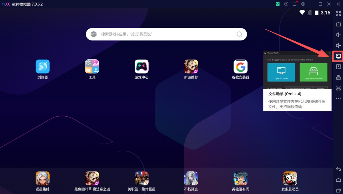 步骤1、启动夜神模拟器,点击右侧工具【文件助手】工具