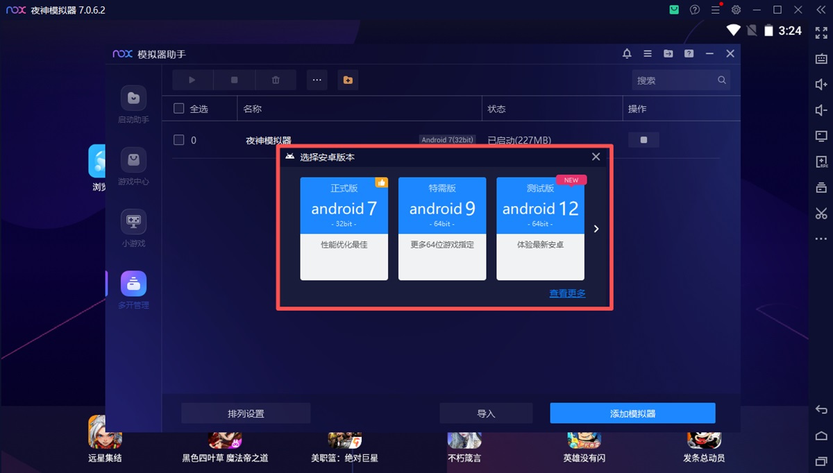 2.「安卓7」版本的特色,能够更好的支持新游戏以及在游戏的效能与流畅执行能够有更好的表现,但是会有电脑配备上的要求并且资源占用方面会比安卓5版本稍高。