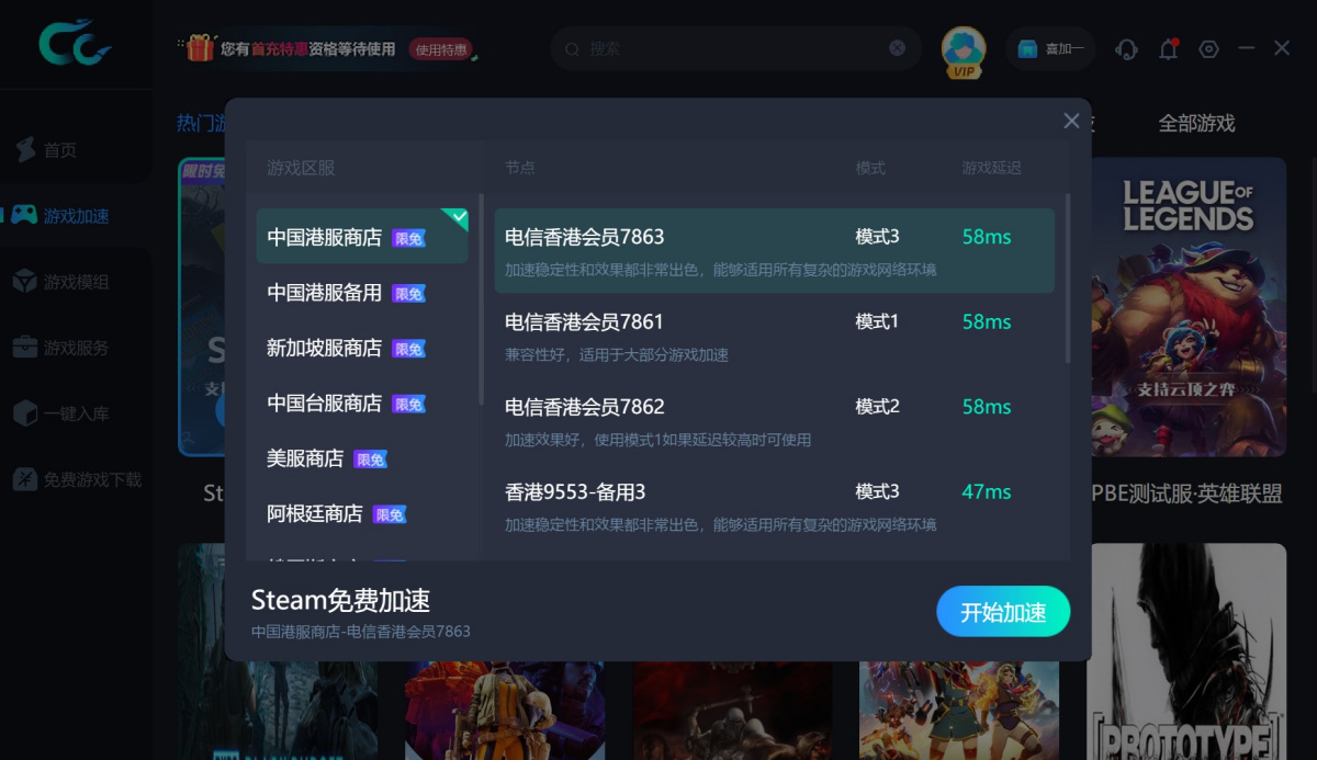 一键跨区入库专用,集成Steam多款热门锁区游戏。