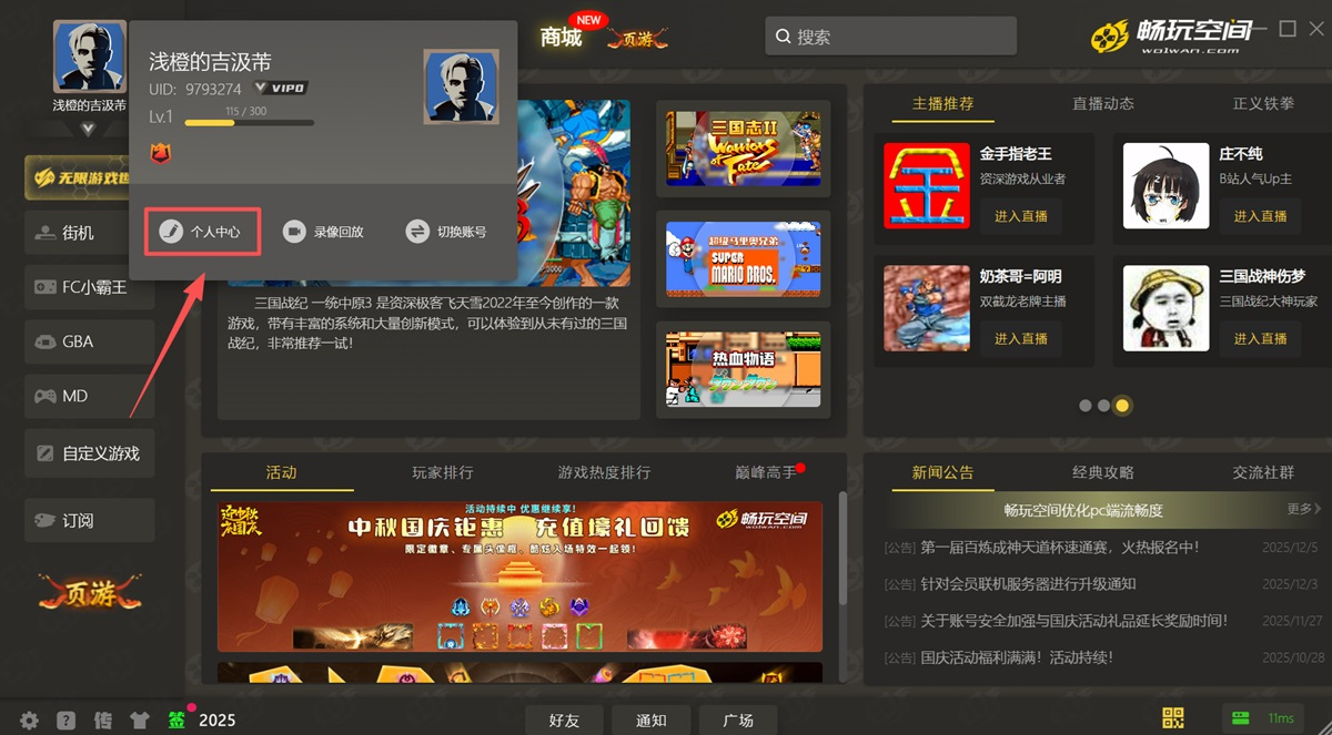 步骤1、打开畅玩空间客户端,点击主界面左上角的【人物头像】