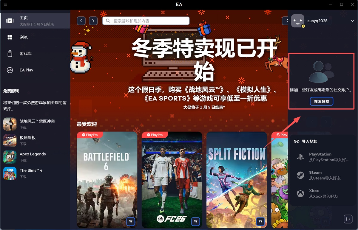 查看您的好友正在游玩什么游戏,并找到 EA 的最新版本,然后再点击几下即可将它们加入到您的游戏库中。